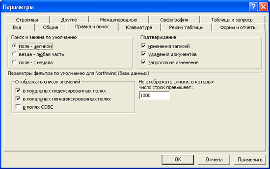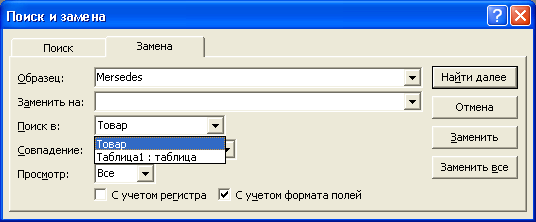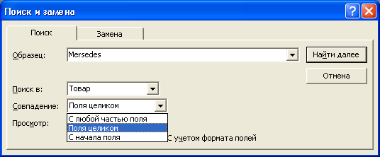 предусмотрены возможности поиска данных по образцу либо в конкретном поле, либо